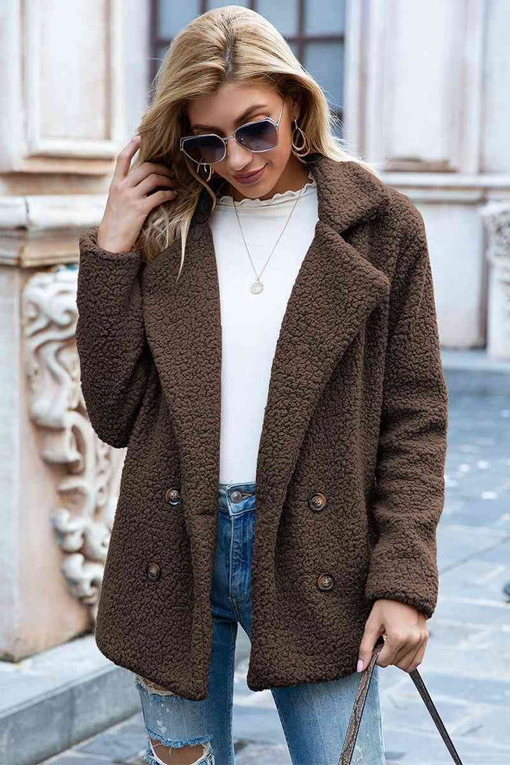 Pattern type: Solid Style: Casual, Urban Features: Double-breasted, Pocketed Neckline: Lapel collar Length: Long Sleeve length: Long sleeves Sleeve type: Regular sleeves Placket type: Double-breasted Material composition: 100% polyester Care instructions:...