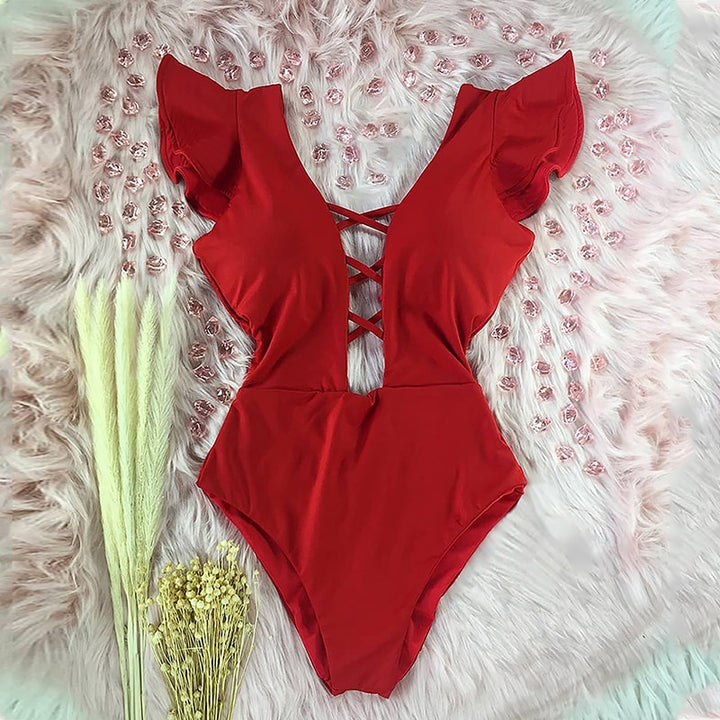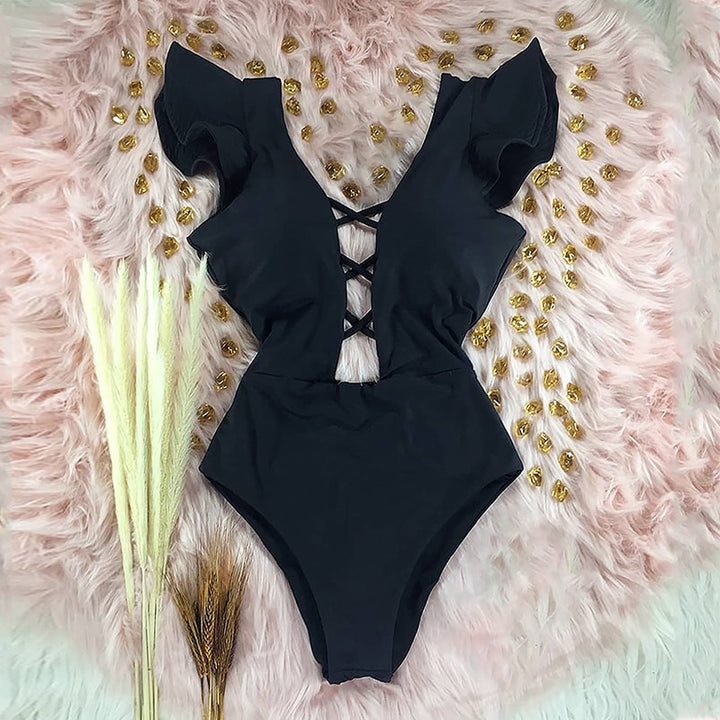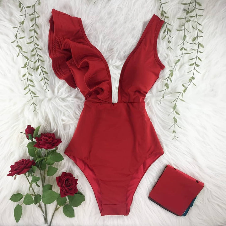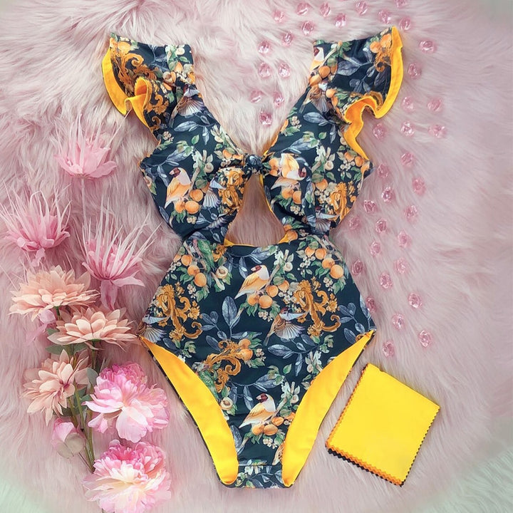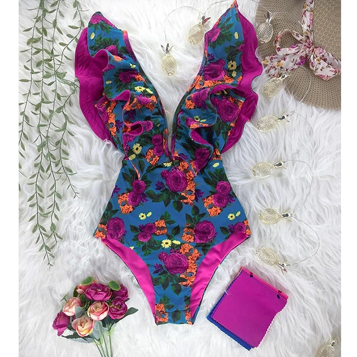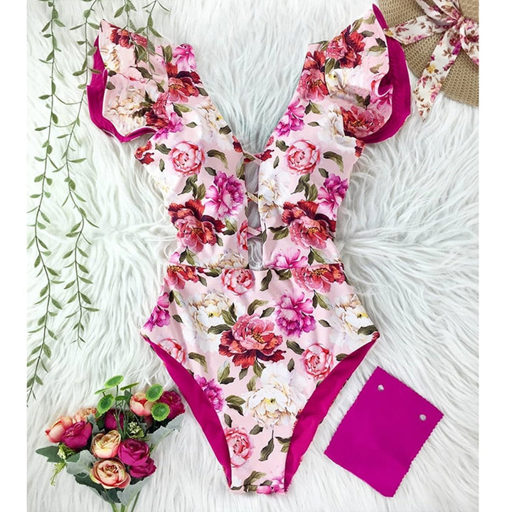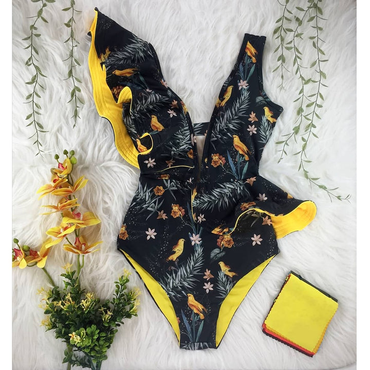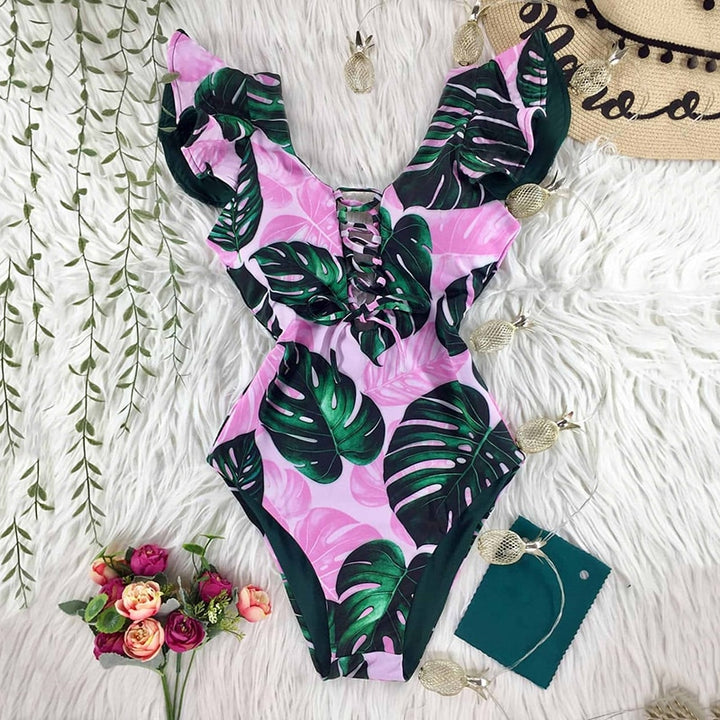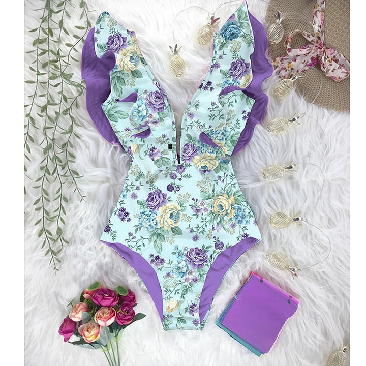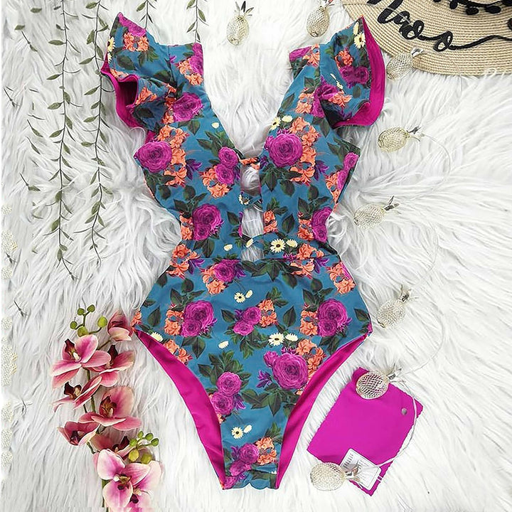 Trendy Printed Deep V-neck Ruffles Monokini
